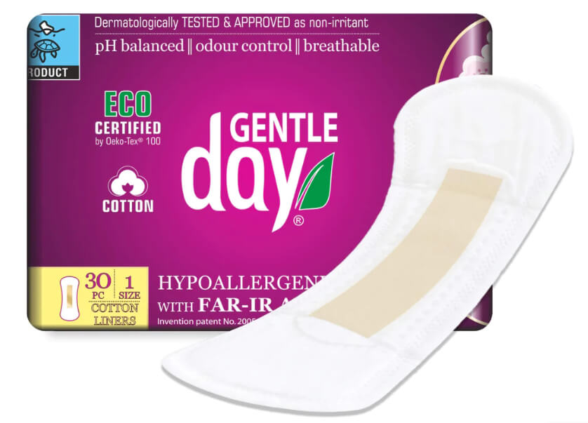 Eko certifikované intimky Gentle Day (Regular Liner, ultra soft with cotton) jsou antibakteriální slipové vložky s bavlněným povrchem, anionovým páskem a FAR-IR biočipem, určené pro každodenní nošení a intimní hygienu. Neobsahují chlór, formaldehyd, aromata ani jiné škodlivé látky. Anionový pásek s turmalínovým minerálem a stříbrem redukuje růst bakterií a eliminuje nepříjemný pach. Bavlněná povrchová vrstva nedráždí pokožku – vhodné i pro ženy s kožními alergiemi. Dermatologicky testováno, pH neutrální, 100% ekologicky odbouratelné. Certifikováno jako zdravotnický materiál. Délka 155 mm.