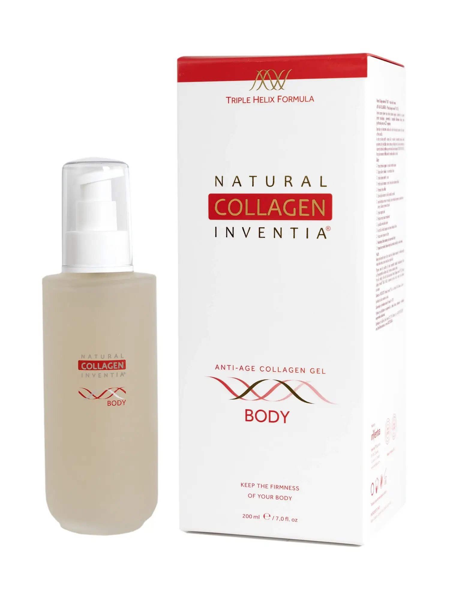 Přírodní živý kolagen Inventia BODY (NATURAL COLLAGEN INVENTIA ANTI-AGE COLLAGEN GEL BODY) je biologicky aktivní tropokolagen v gelové formě, speciálně vyvinutý pro intenzivní anti-age péči o pokožku celého těla. Zpevňuje ochablou pokožku, výrazně hydratuje, redukuje celulitidu a strie, urychluje regeneraci po opalování, epilaci i porodu. Přípravek je 100 % přírodní, bez parabenů a konzervantů, dermatologicky testovaný a hypoalergenní – vhodný pro všechny typy pleti včetně suché, citlivé a alergické. Dostupný v objemech 50 ml, 100 ml a 200 ml.