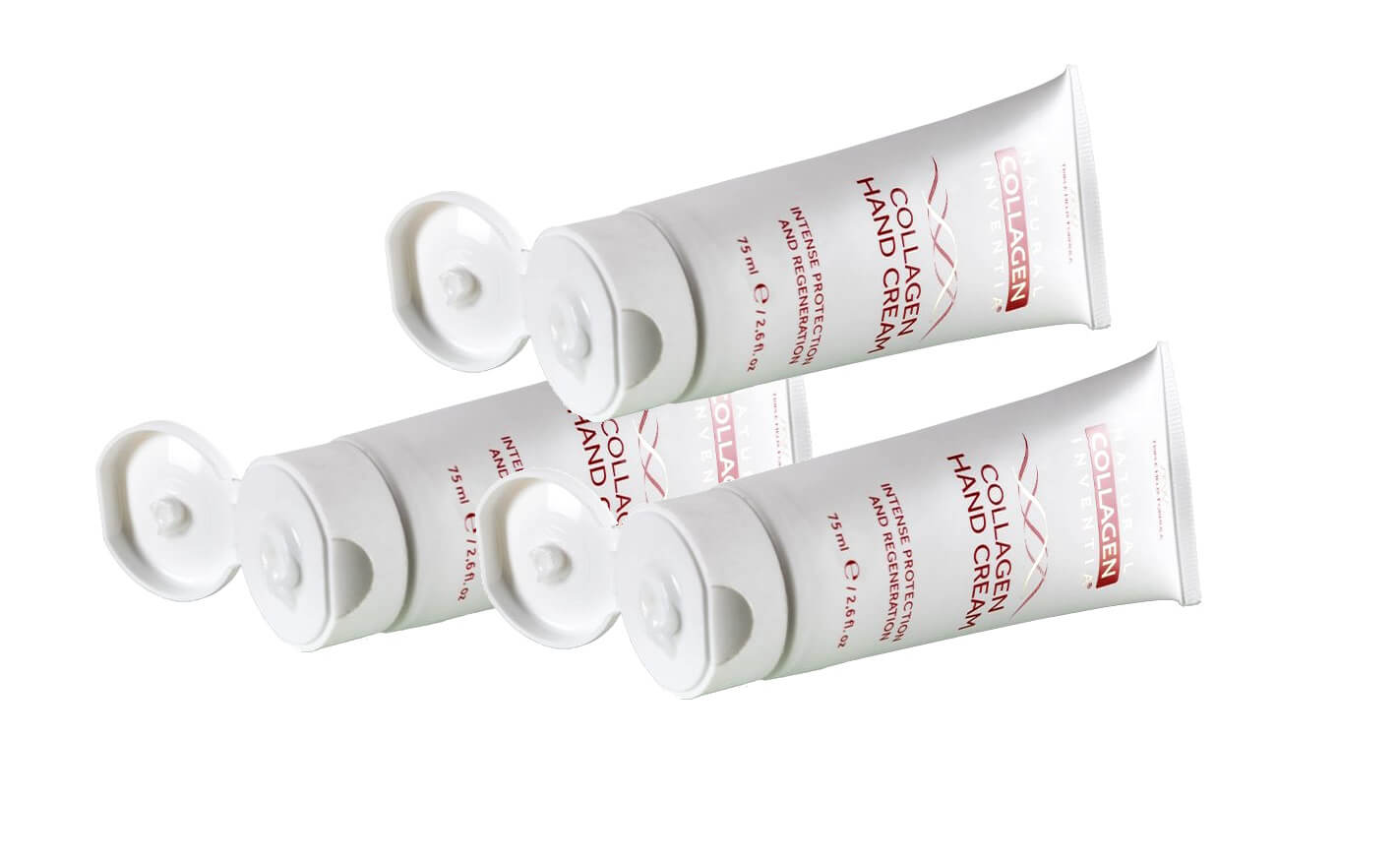Collagen Hand Cream Inventia je luxusní omlazující a regenerační krém na ruce s obsahem přírodního živého kolagenu (tropokolagenu). Je navržen pro intenzivní péči o suchou, popraskanou a ekzematickou pokožku rukou, kterou okamžitě zklidňuje a hydratuje. Unikátní receptura s výtažkem z bílého kaviáru, hypoalergenním lanolinem a močovinou (Urea) posiluje ochrannou bariéru kůže, vyhlazuje vrásky na hřbetech rukou a pěstí nehtová lůžka. Krém má nemastné složení, nelepí a rychle se vstřebává, což jej činí ideálním pro každodenní použití i po práci na zahradě nebo časté dezinfekci rukou. Krém Collagen Hand Cream je dermatologicky testovaný a jeho receptura je bez parabenů.