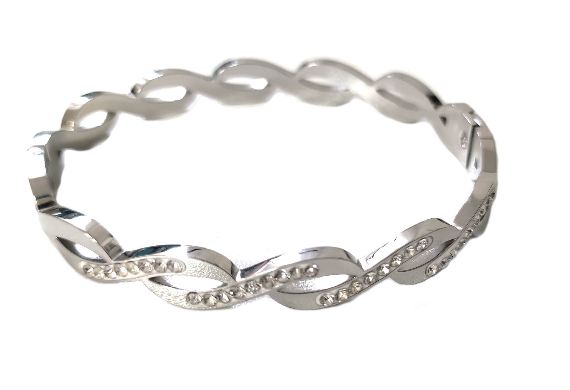 Třpytivý dámský náramek v designu pletence, zdobený precizně osazenými krystaly na jedné polovině, představuje dokonalou harmonii luxusního vzhledu a odolnosti. Vyroben z prvotřídní chirurgické oceli 316L pomocí PVD technologie, je náramek hypoalergenní, barevně stálý a odolný vůči vnějším vlivům. Praktické boční otevírání zajišťuje bezpečné a pohodlné nošení.